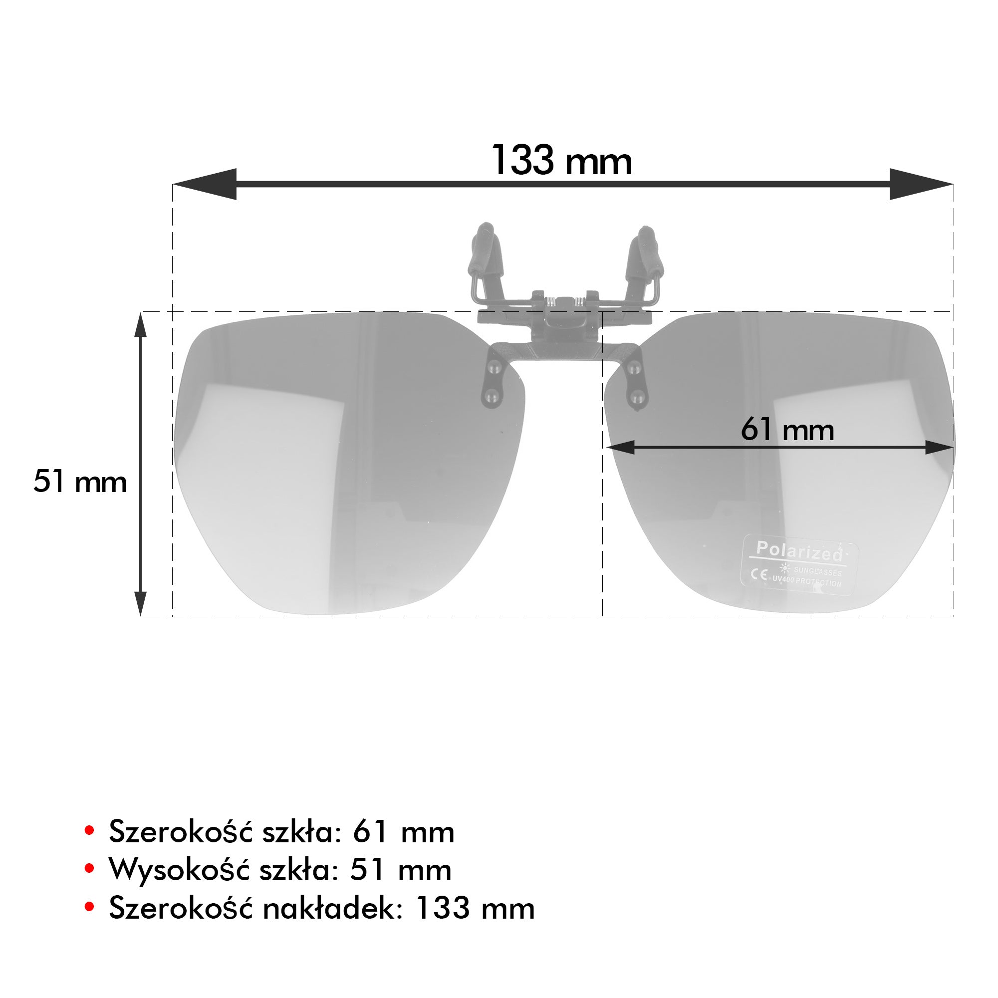 Nakładki polaryzacyjne na okulary to świetne i szybkie rozwiązanie dla osób noszących okulary korekcyjne i zerówki. Nakładki posiadają uchwyt (klips), który umożliwia założenie ich na okulary. Dzięki niemu nakładkę można odchylić bez konieczności jej odpinania. Zastosowane w klipsie mocującym gumowe końcówki chronią szkła okularów oraz oprawki przed zarysowaniem. Nakładki wykonane są z elastycznego, wytrzymałego materiału, dzięki czemu z łatwością dopasowują się do okularów. W razie potrzeby nakładki można przyciąć ostrymi nożyczkami i dopasować ich rozmiar do swoich okularów.