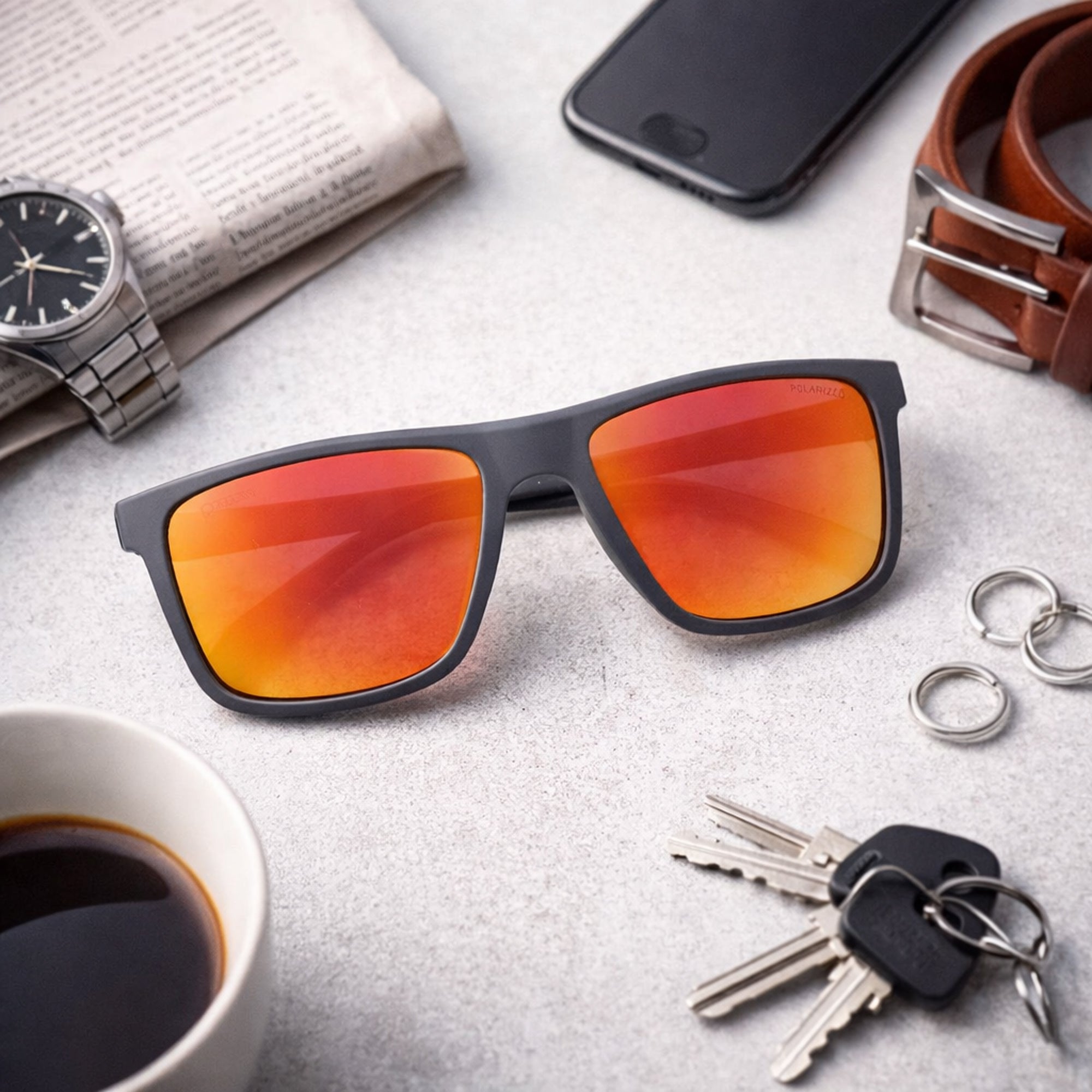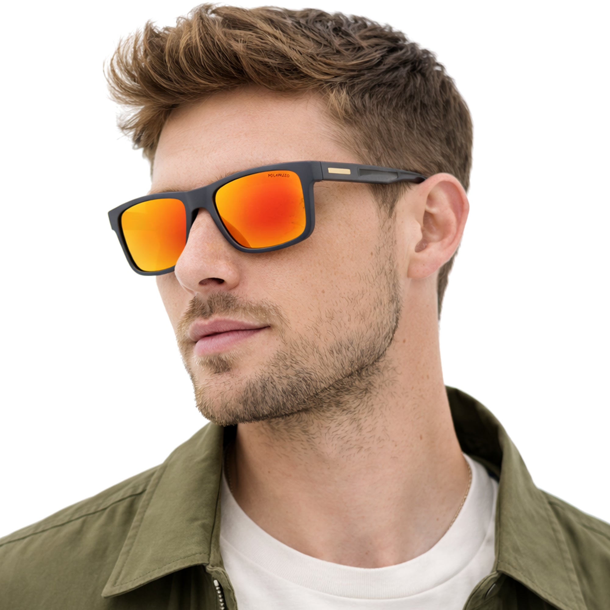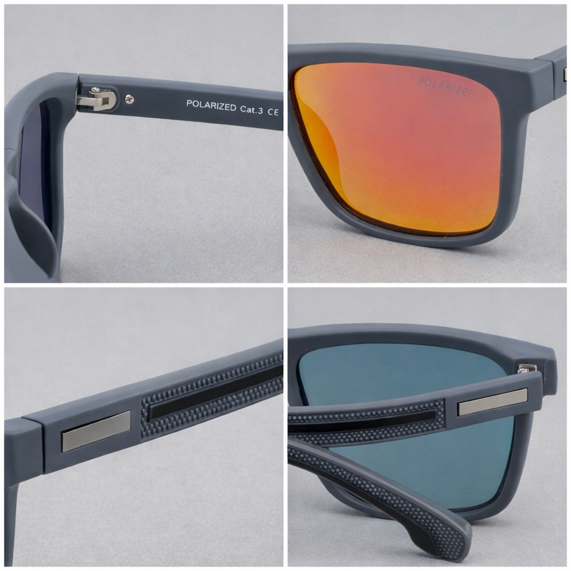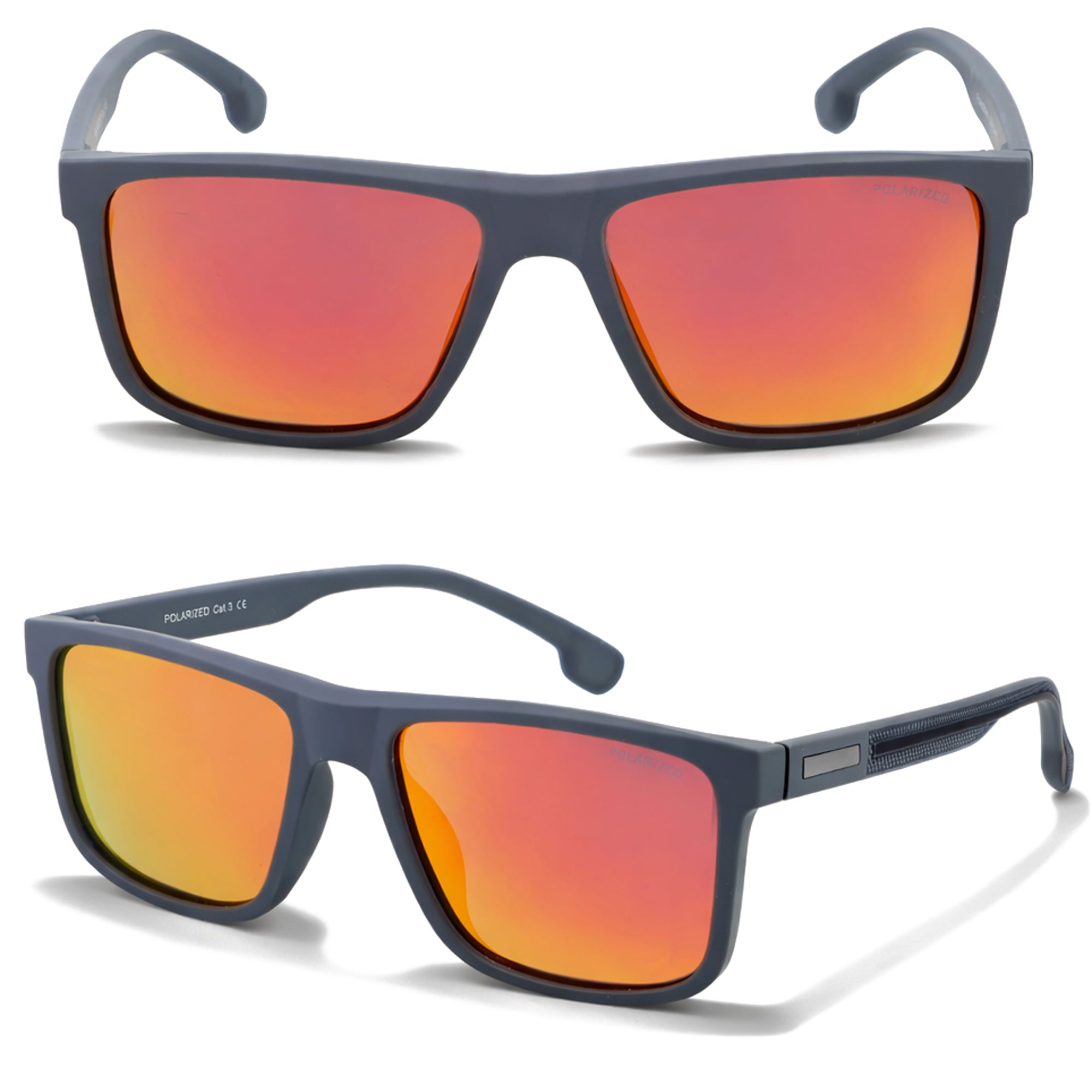 Grafit Amber to męskie okulary przeciwsłoneczne w pełnych, kwadratowych oprawkach typu nerdy w kolorze szarym, wykonanych z poliwęglanu. Pomarańczowe, lustrzane szkła polaryzacyjne zapewniają ochronę UV-400 (kategoria 3, 82–92%) i poprawiają komfort widzenia w silnym słońcu.