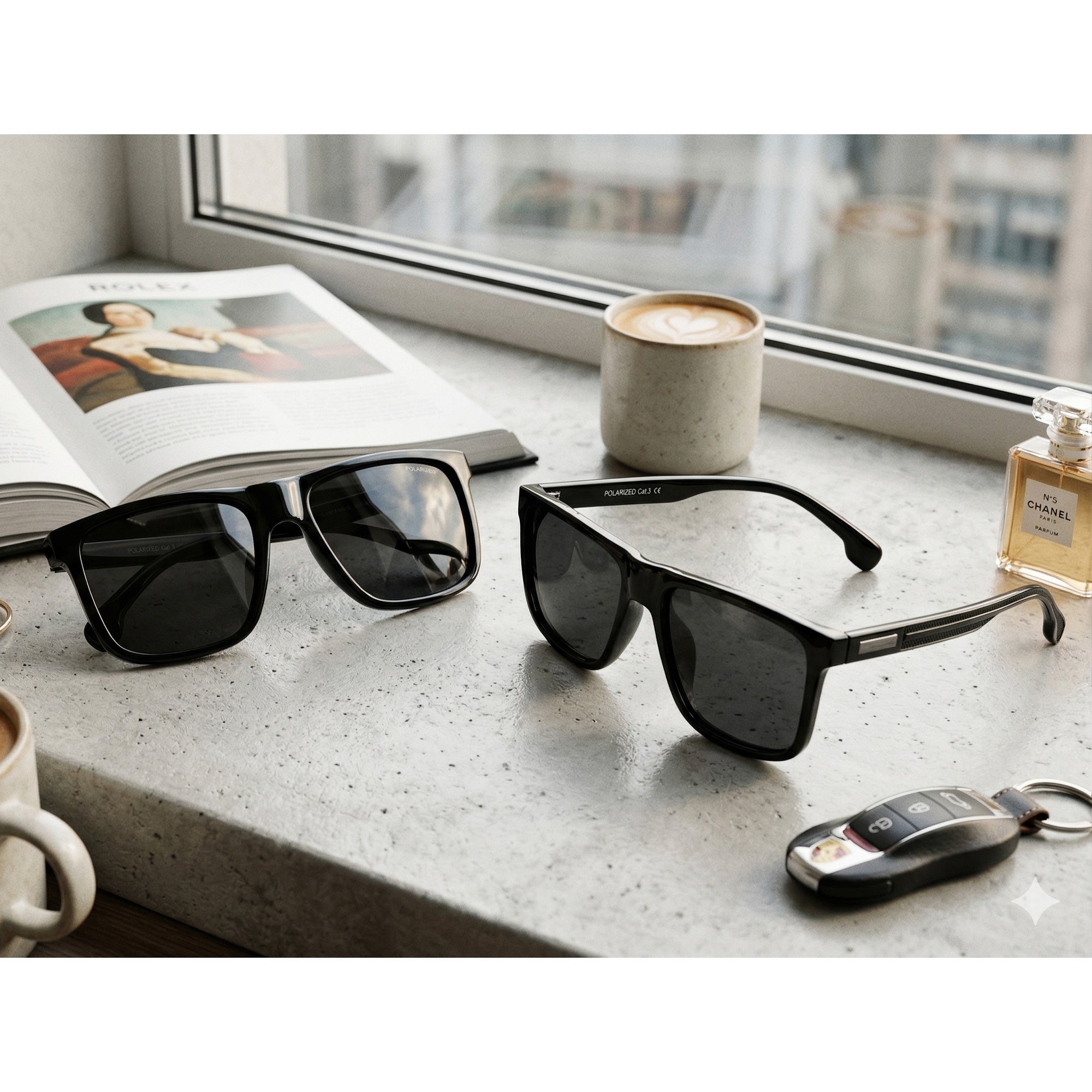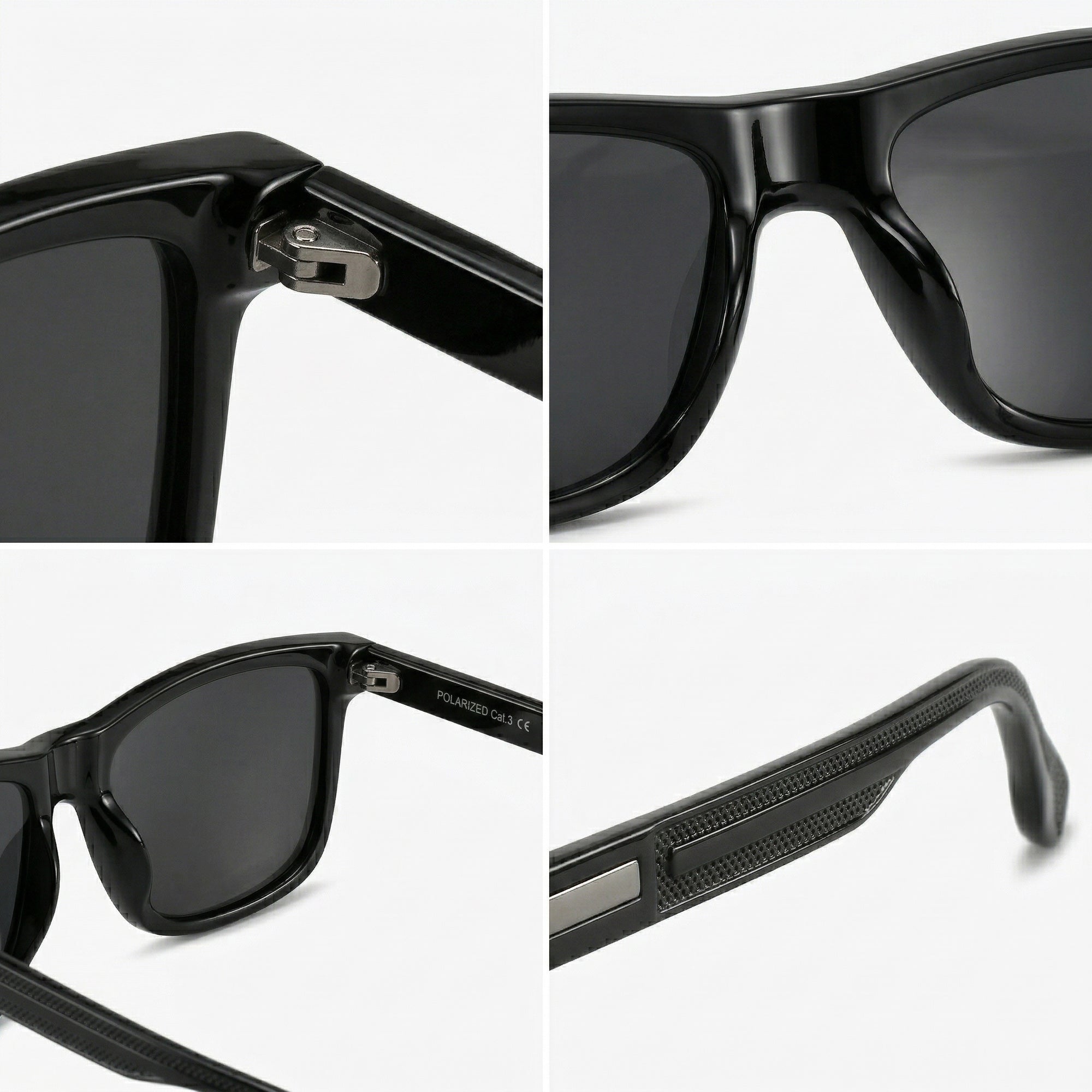 Okulary Noir Nerd to męskie okulary przeciwsłoneczne o kwadratowych, pełnych oprawkach w czarnym kolorze, wykonanych z lekkiego poliwęglanu. Czarne soczewki polaryzacyjne z filtrem UV-400 (kat. 3, 82–92%) skutecznie redukują odblaski i zapewniają komfort widzenia w intensywnym słońcu. Model posiada stałe noski i klasyczne, nieelastyczne zauszniki.