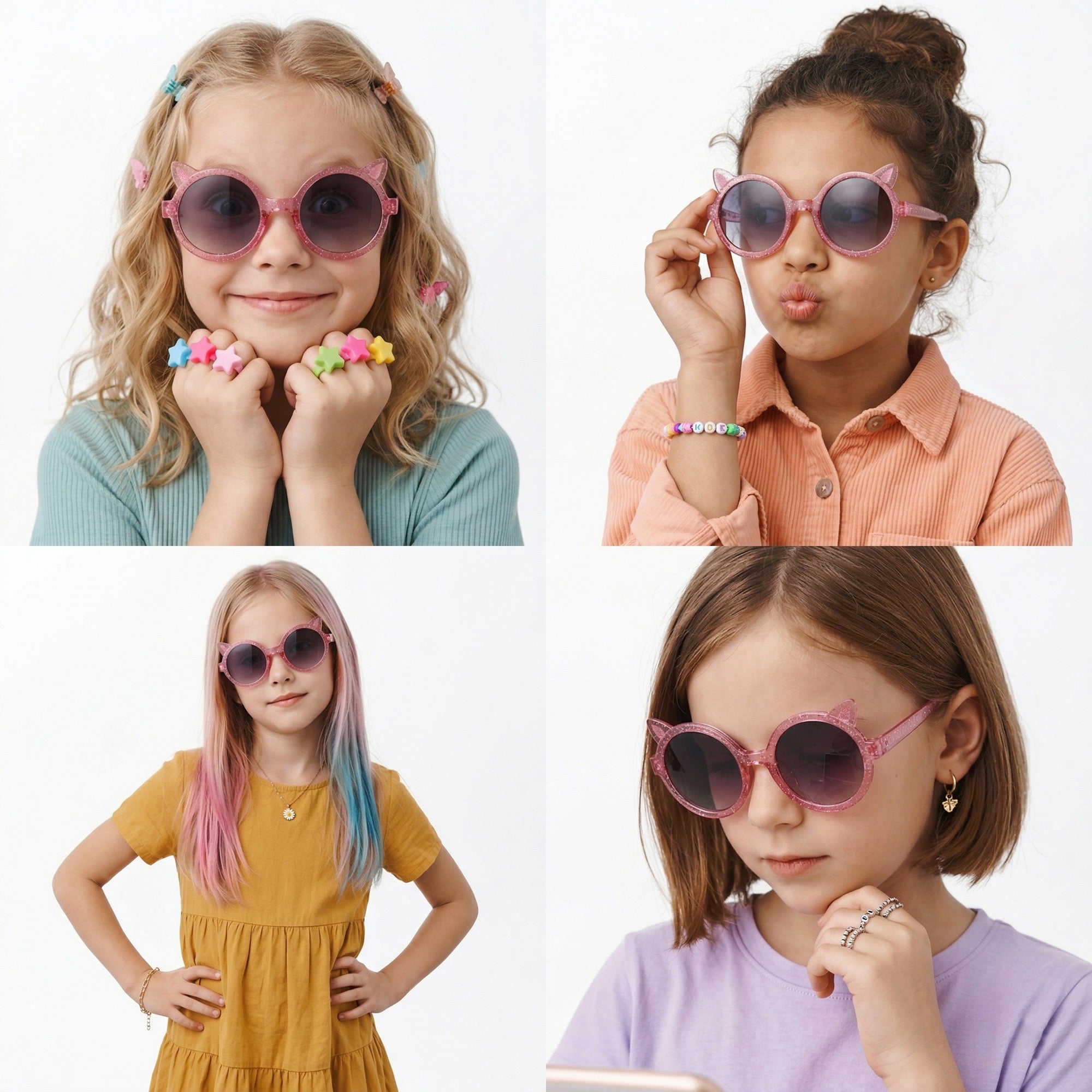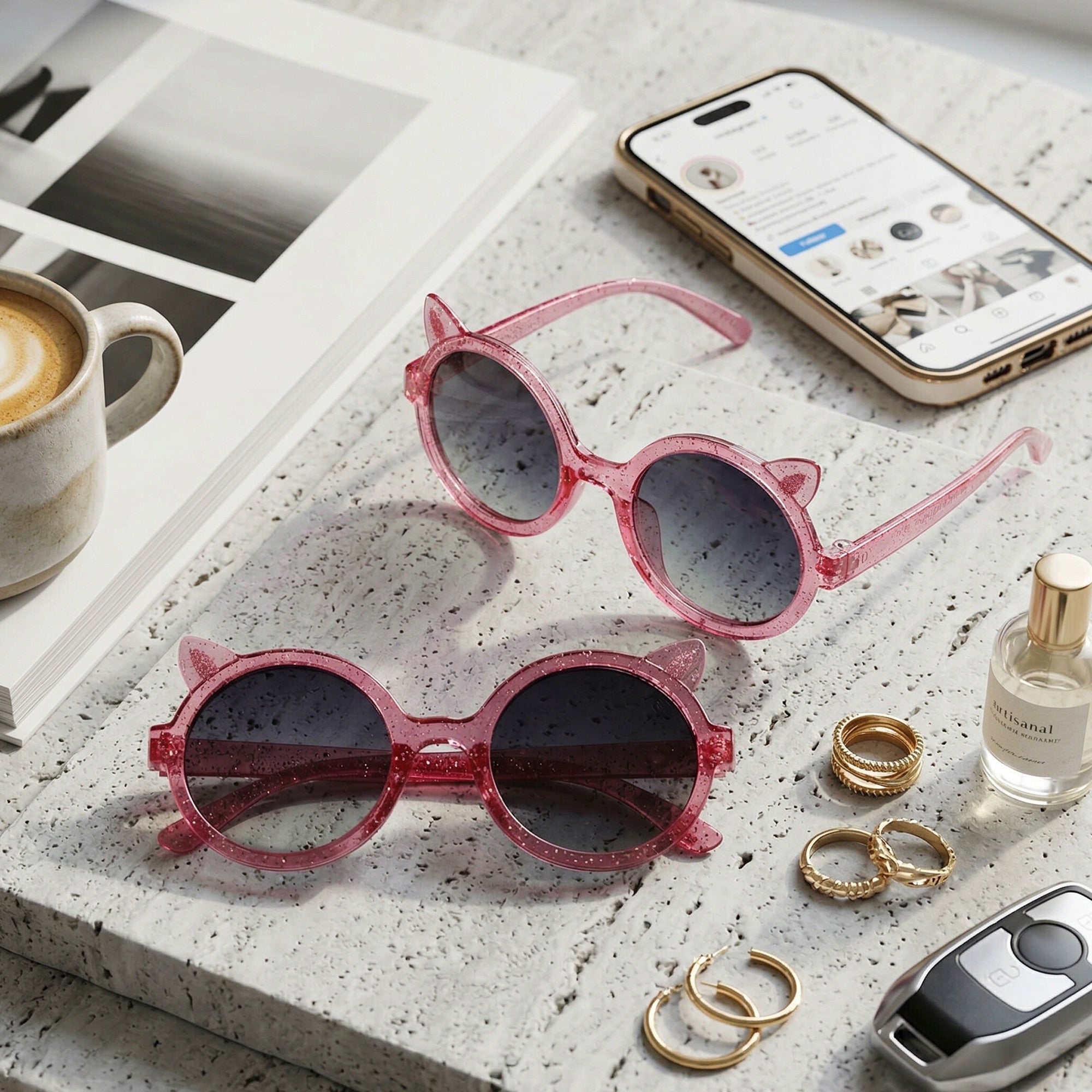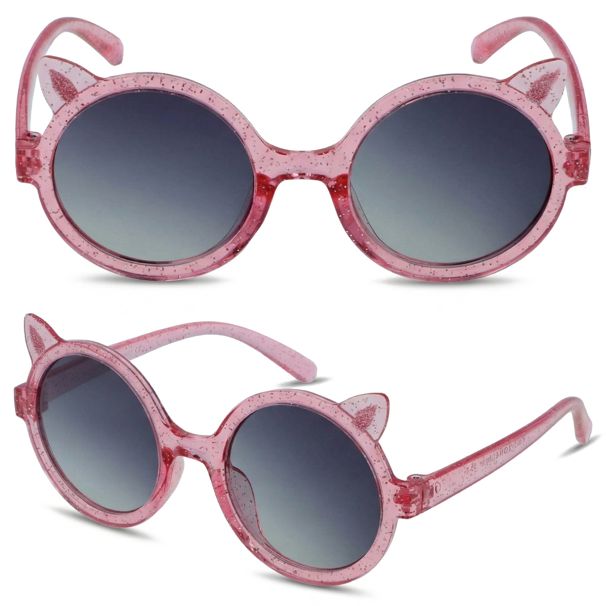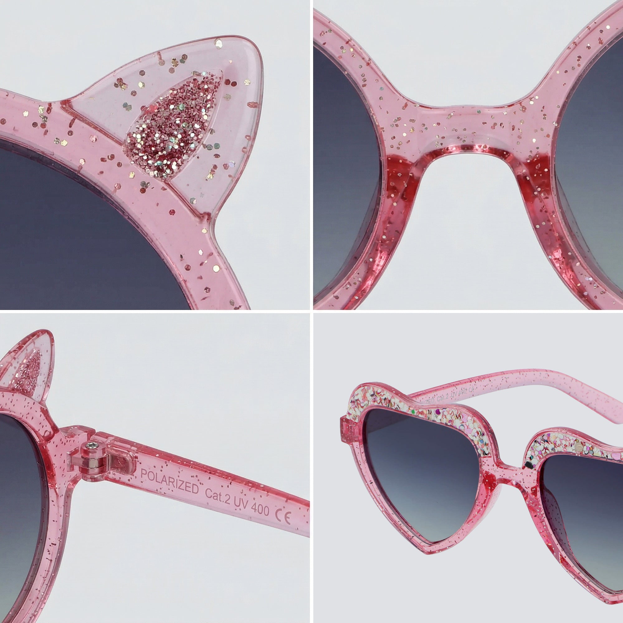 Okulary Sunny Smile to stylowe okulary przeciwsłoneczne dla dziewczynek, z różowymi pełnymi oprawkami z plastiku i okrągłym kształtem. Czarne soczewki polaryzacyjne z filtrem UV-400 (kat. 2, 57–82%) zapewniają skuteczną ochronę przed słońcem oraz komfort widzenia podczas aktywności na świeżym powietrzu. Model posiada stałe noski i nieelastyczne zauszniki, a bezpieczeństwo użytkowania potwierdza certyfikat CE.