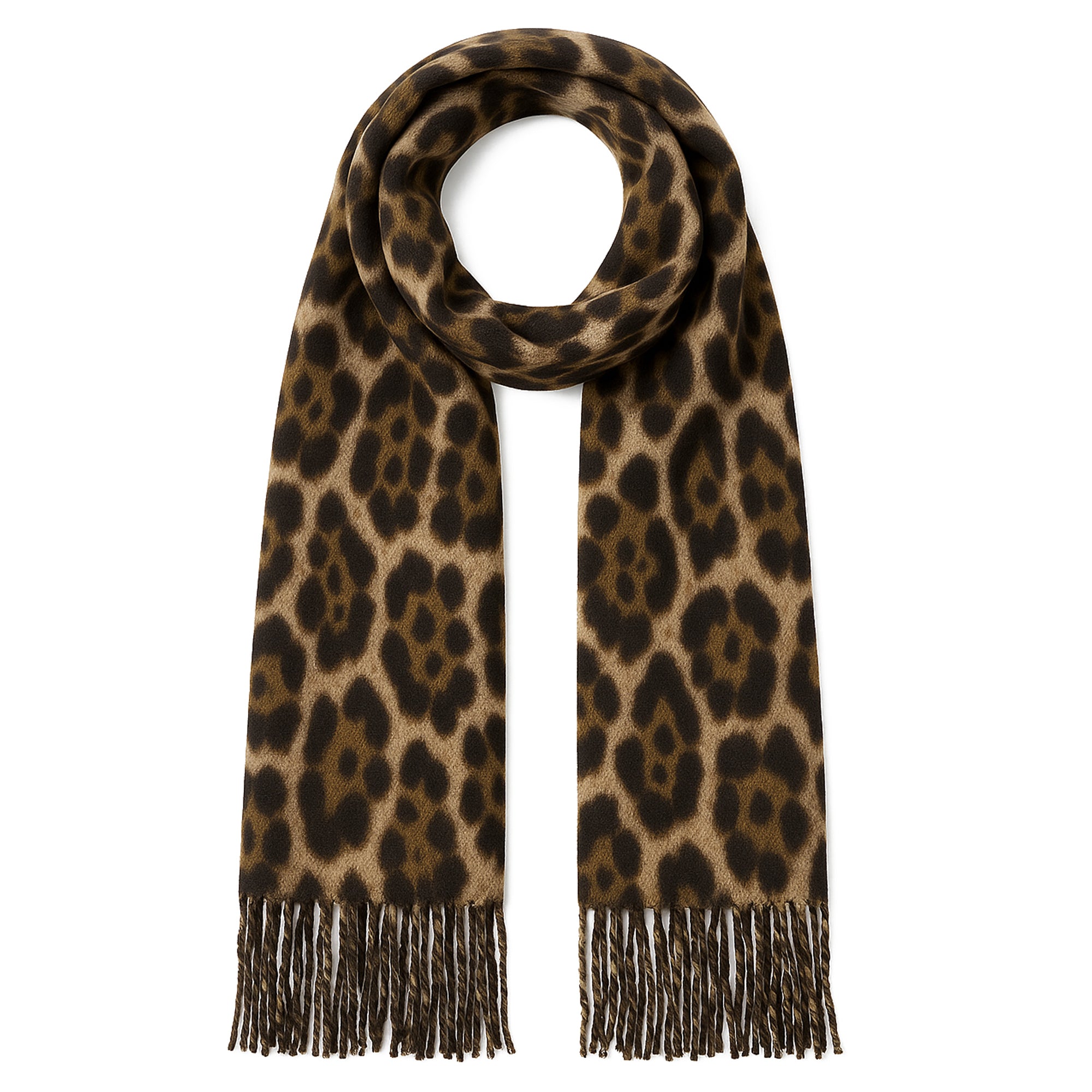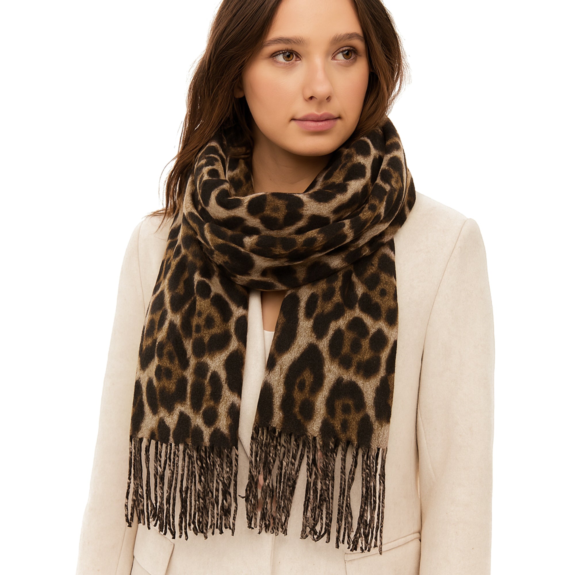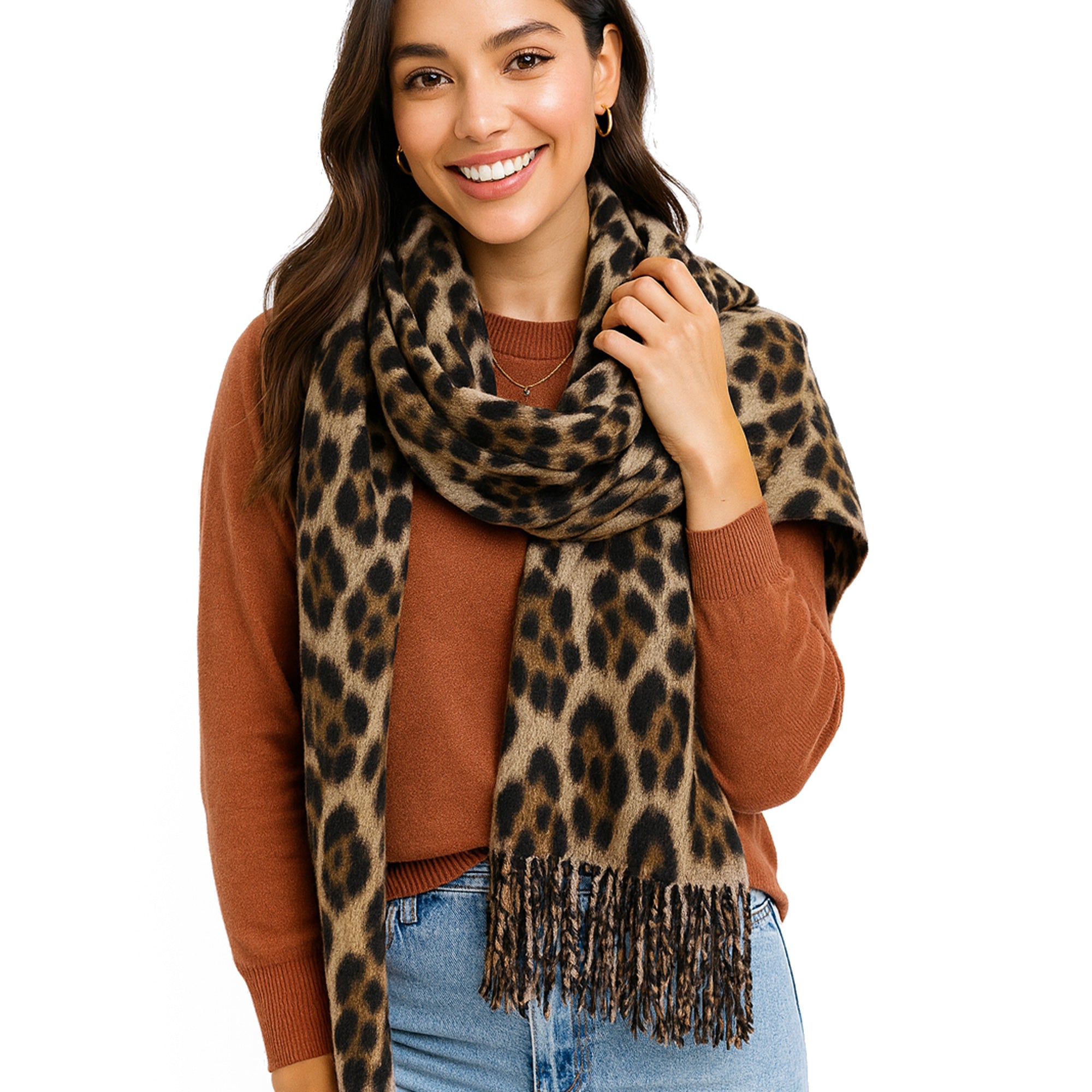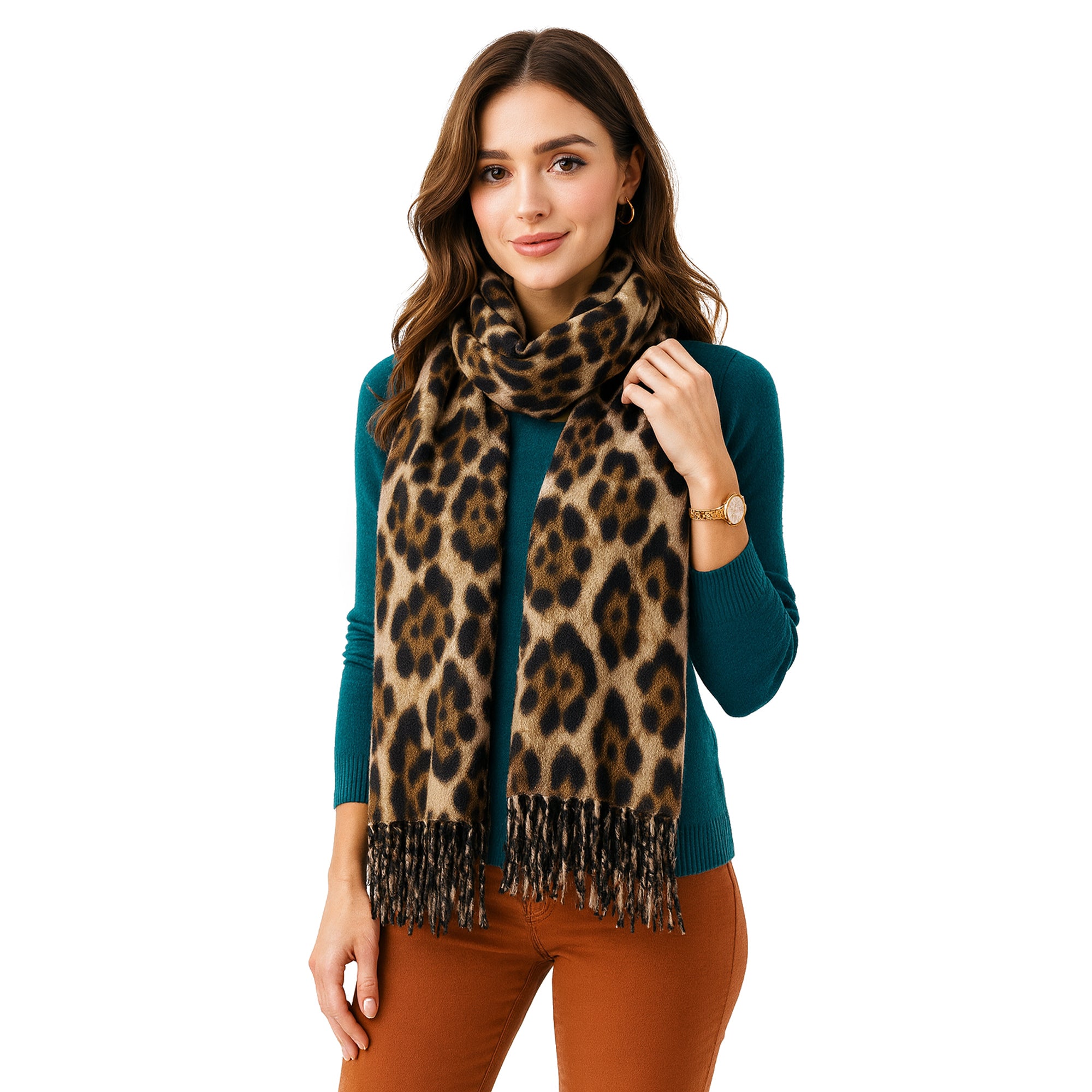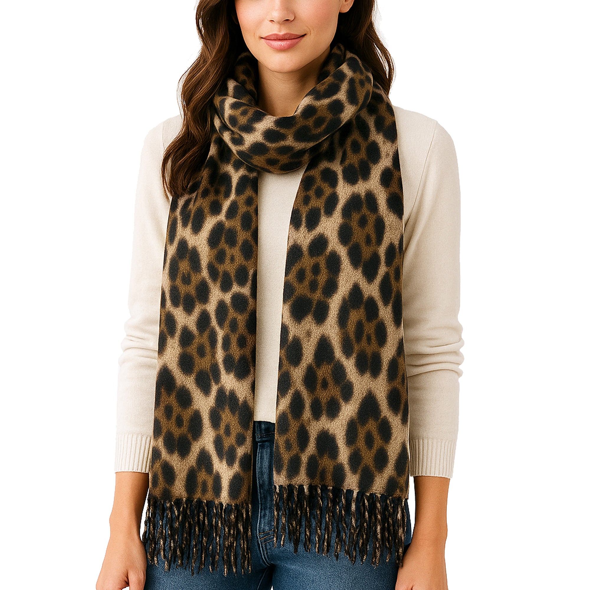 Damski szal w modny zwierzęcy wzór to elegancki i wyrazisty dodatek, który podkreśli każdą stylizację. Wykonany z mieszanki 50% bawełny i 50% wiskozy, jest miękki, lekki i przyjemny w dotyku, a jednocześnie zapewnia komfort noszenia w chłodniejsze dni. Szal ma wymiary 68 × 196 cm, a jego wykończenie stanowią ozdobne frędzle o długości 9 cm, które dodają całości lekkości i swobodnego charakteru. Wzór w odcieniach brązu i czerni nadaje mu ponadczasowego stylu inspirowanego modą safari i świetnie komponuje się zarówno z klasycznymi, jak i nowoczesnymi outfitami. To idealny wybór dla kobiet ceniących elegancję z nutą drapieżności.