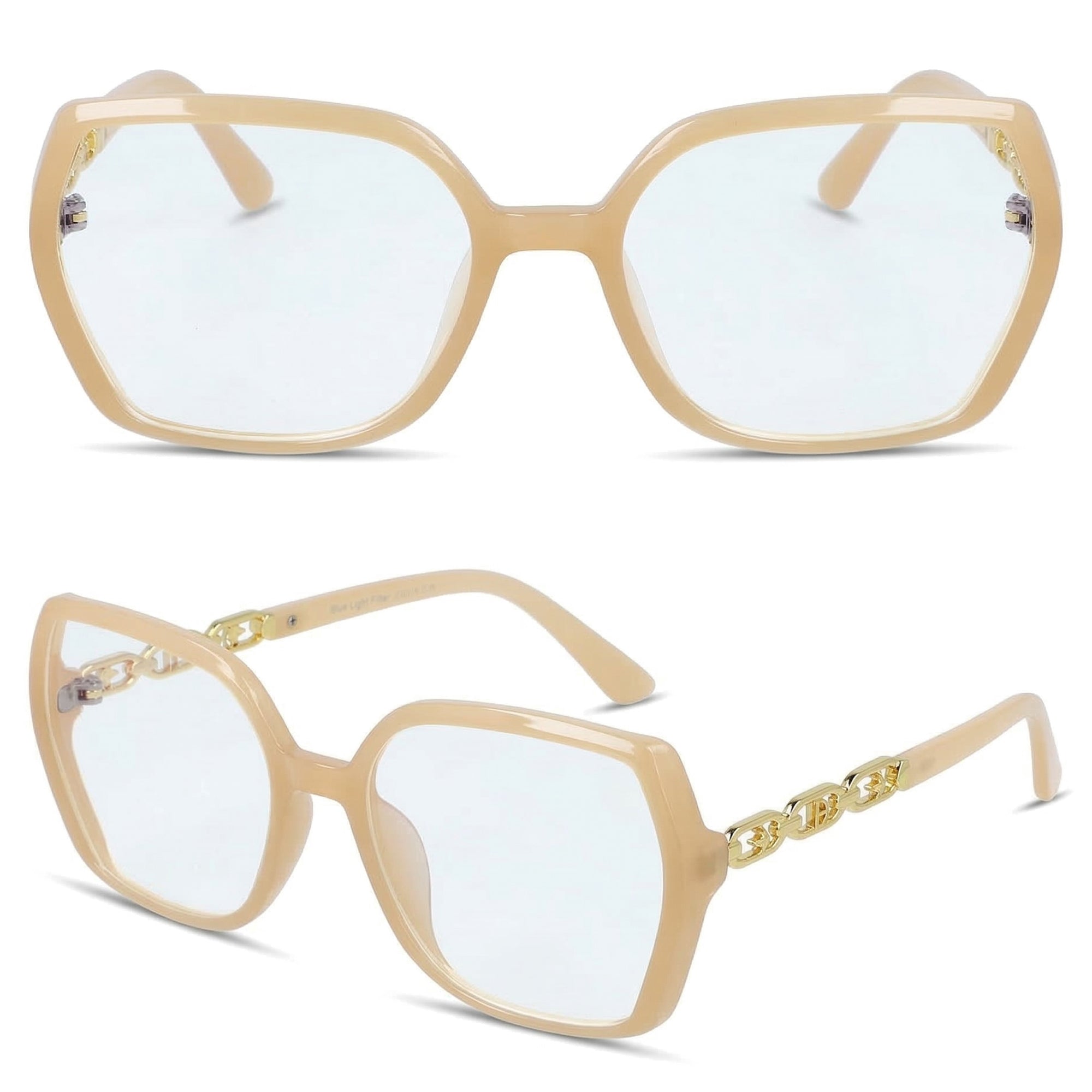 Damskie okulary AURIA to model o pełnych oprawkach w beżowym kolorze, wykonany z trwałego poliwęglanu. Te kwadratowe zerówki wyposażono w bezbarwne szkła z filtrem blue-light i powłoką antyrefleksyjną, co redukuje odblaski i chroni wzrok podczas pracy przed ekranem. Stałe noski stabilizują oprawę, a fabryczne soczewki można dostosować do indywidualnej wady wzroku poprzez wymianę na szkła korekcyjne.
