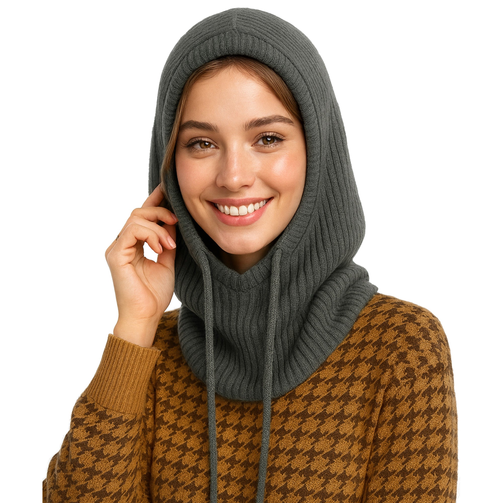 Stylowa balaclava unisex to idealne połączenie modnego designu i funkcjonalności. Wykonana z miękkiej, elastycznej dzianiny o prążkowanej strukturze, doskonale dopasowuje się do kształtu głowy, zapewniając ciepło i wygodę podczas chłodniejszych dni. Model z obszernym kapturem i sznurkami do regulacji można nosić na wiele sposobów – jako kaptur, komin lub osłonę szyi. Balaclava świetnie sprawdzi się zarówno w miejskich stylizacjach, jak i podczas zimowych spacerów. Cechy produktu: To must-have sezonu zimowego – dodatek, który łączy nowoczesny styl z komfortem i ochroną przed chłodem.