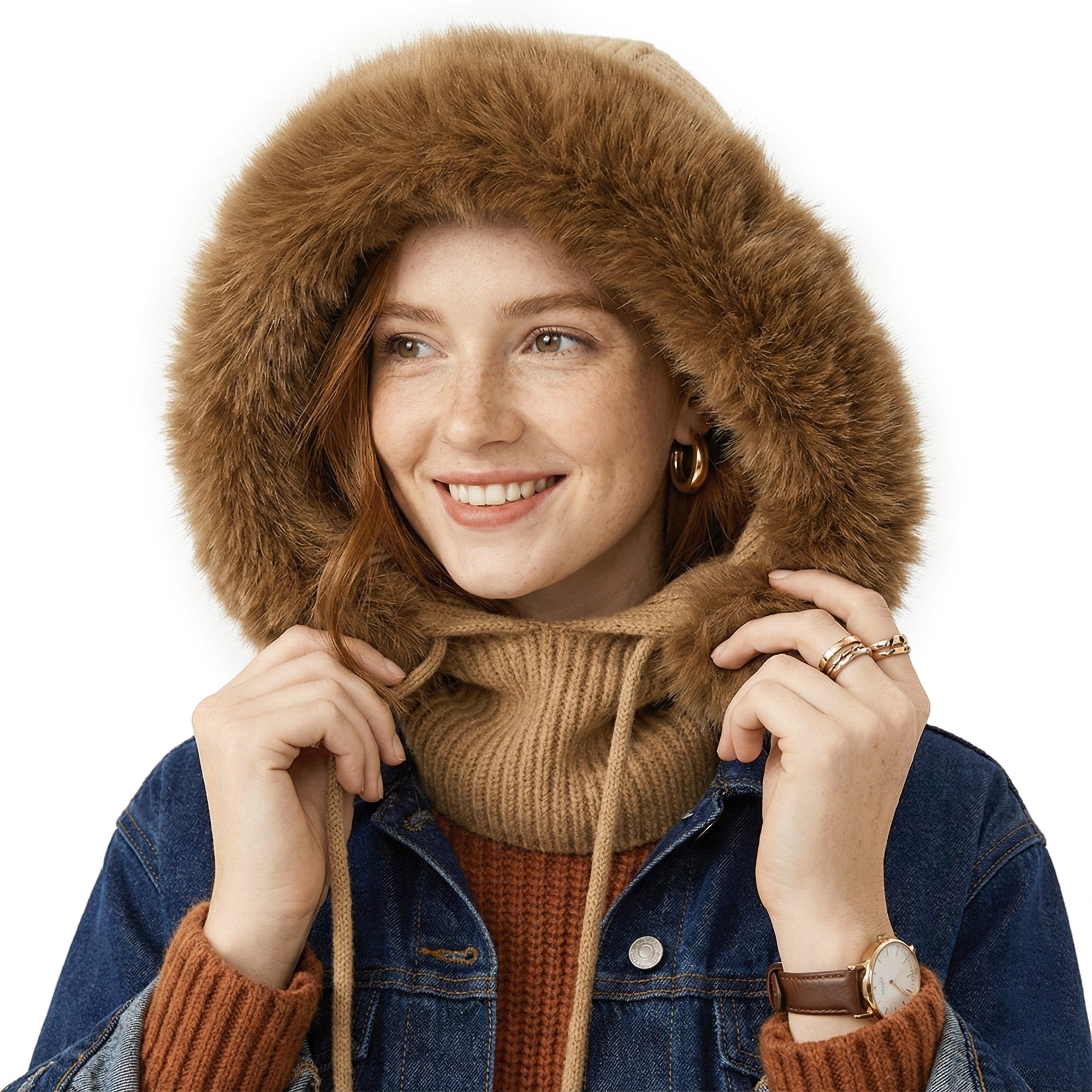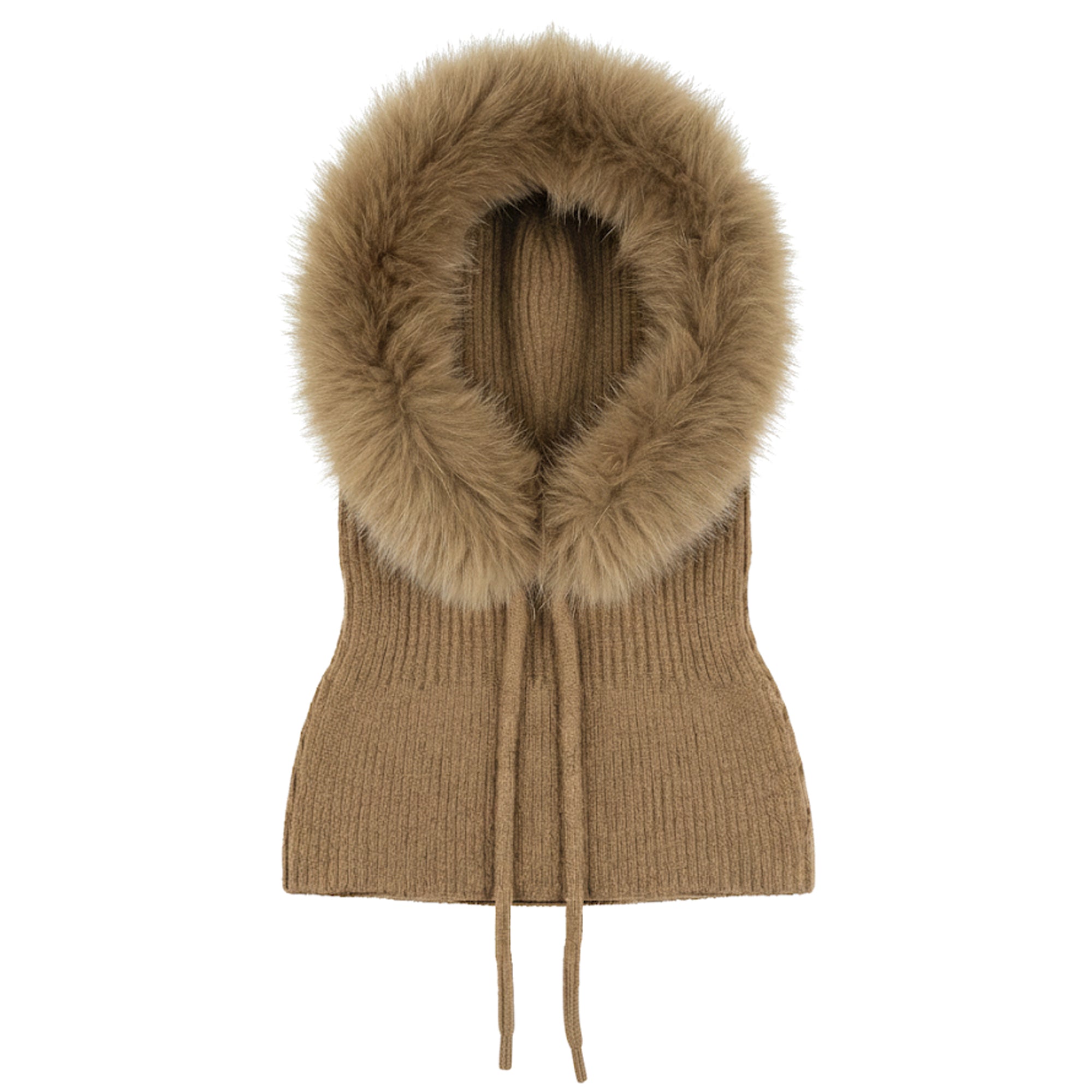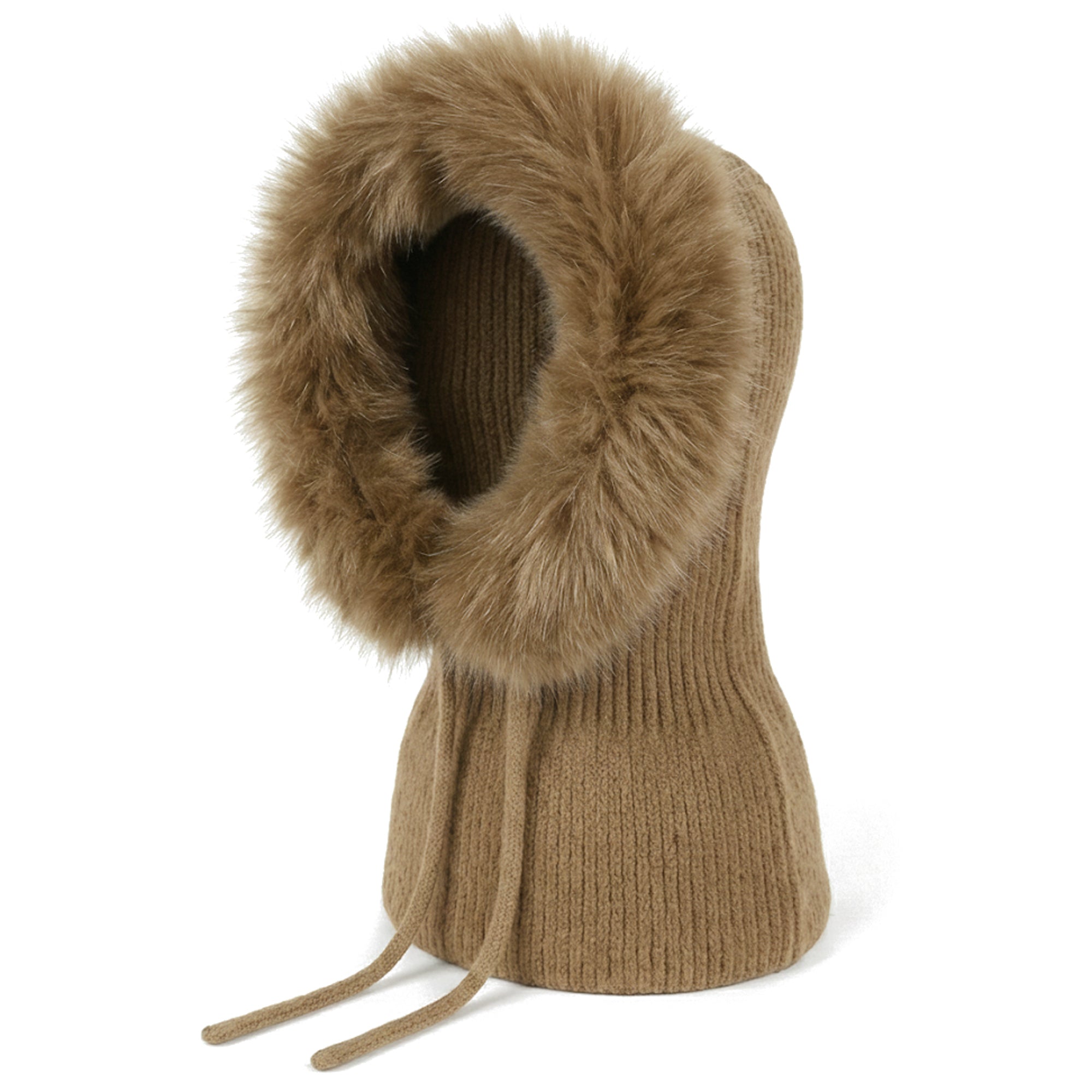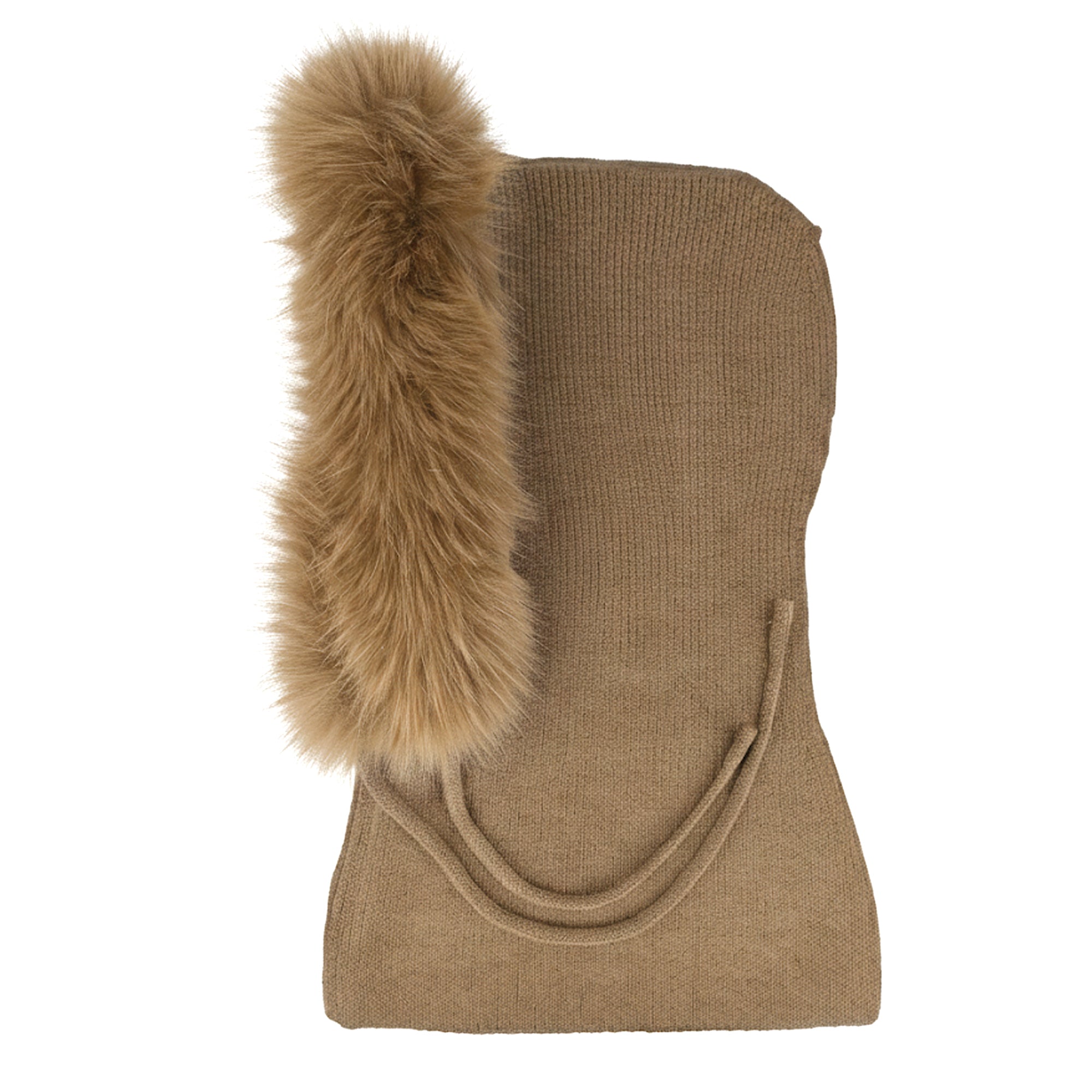 BEŻOWY KAPTUR komin BALACLAVA z FUTERKIEM kominiarka CZAPKA damska