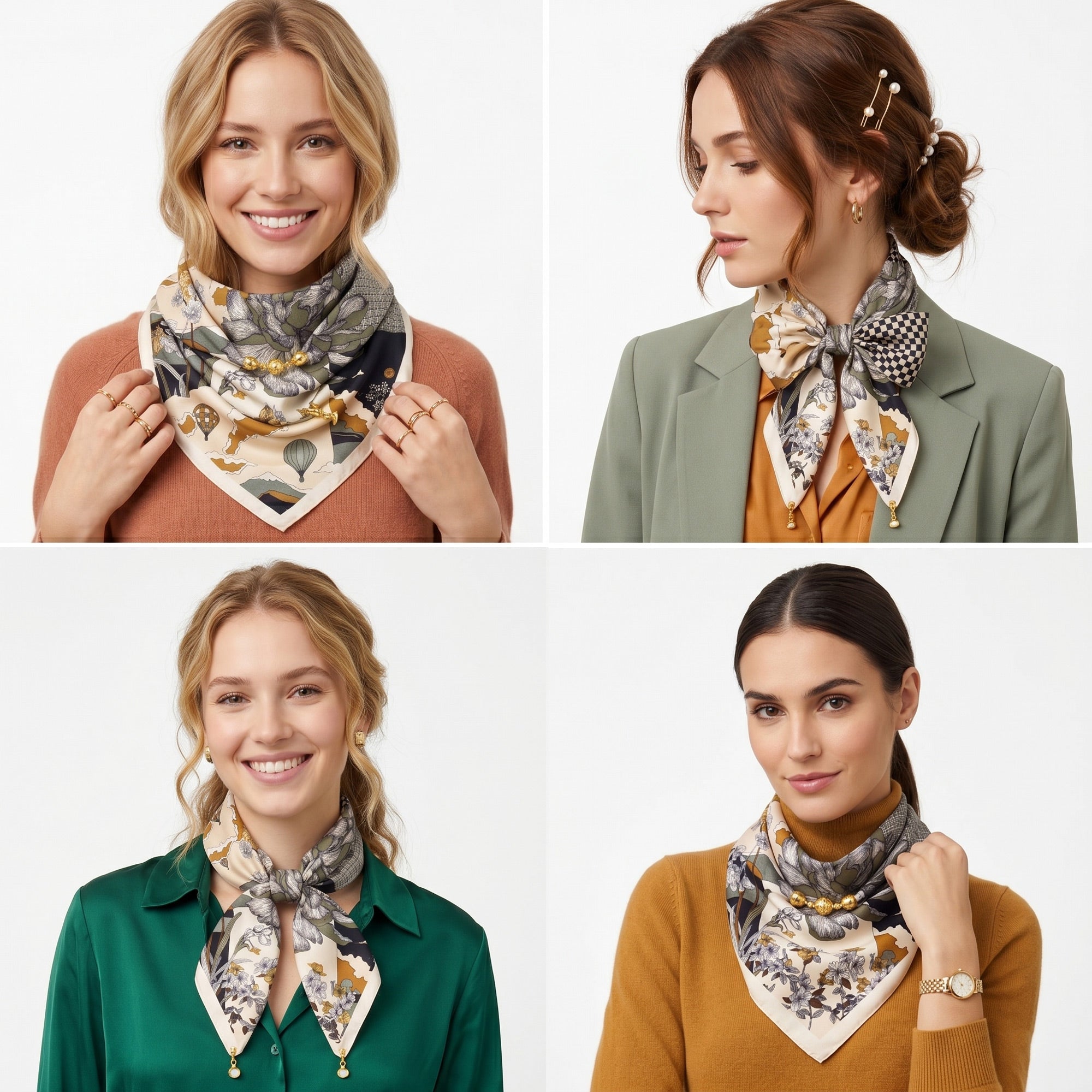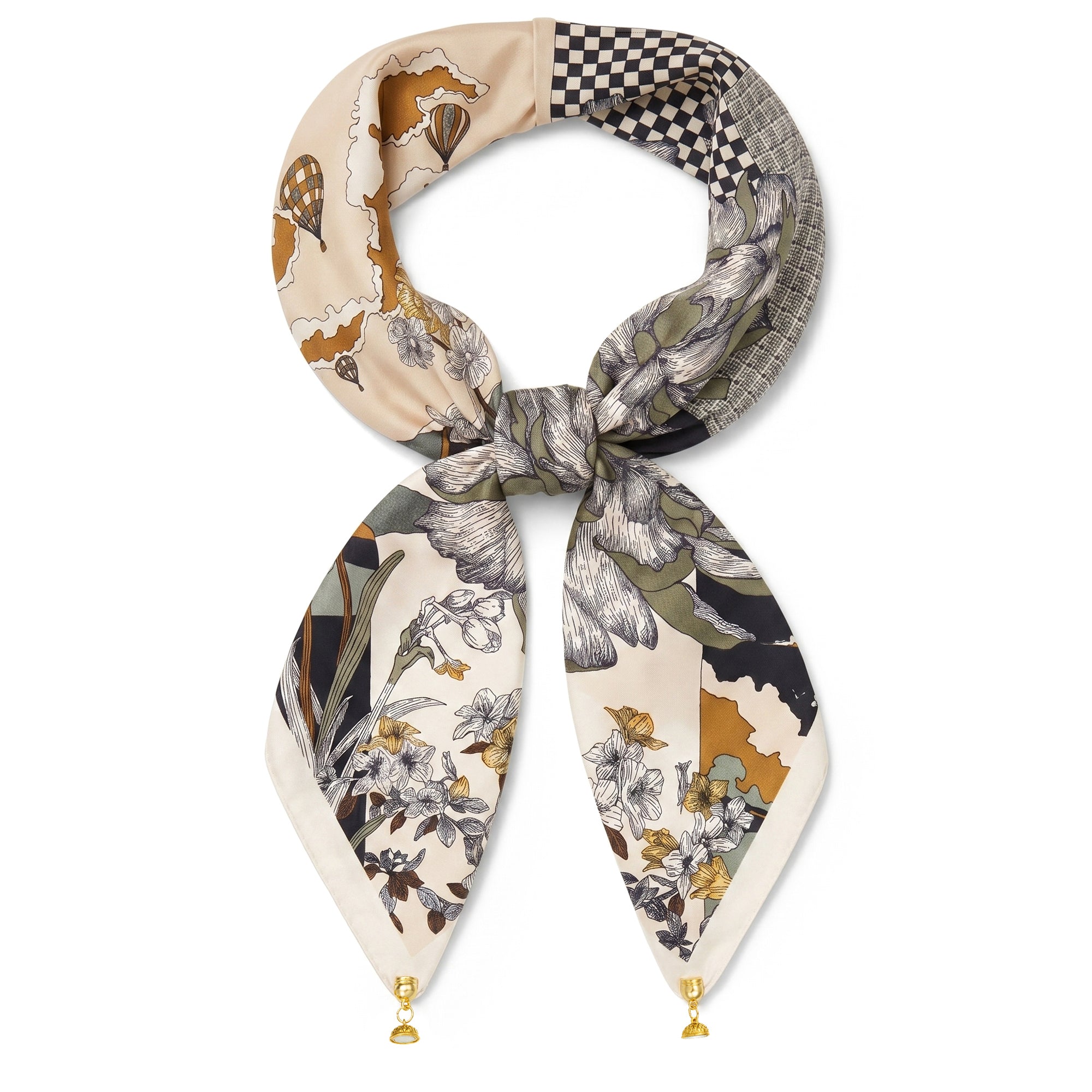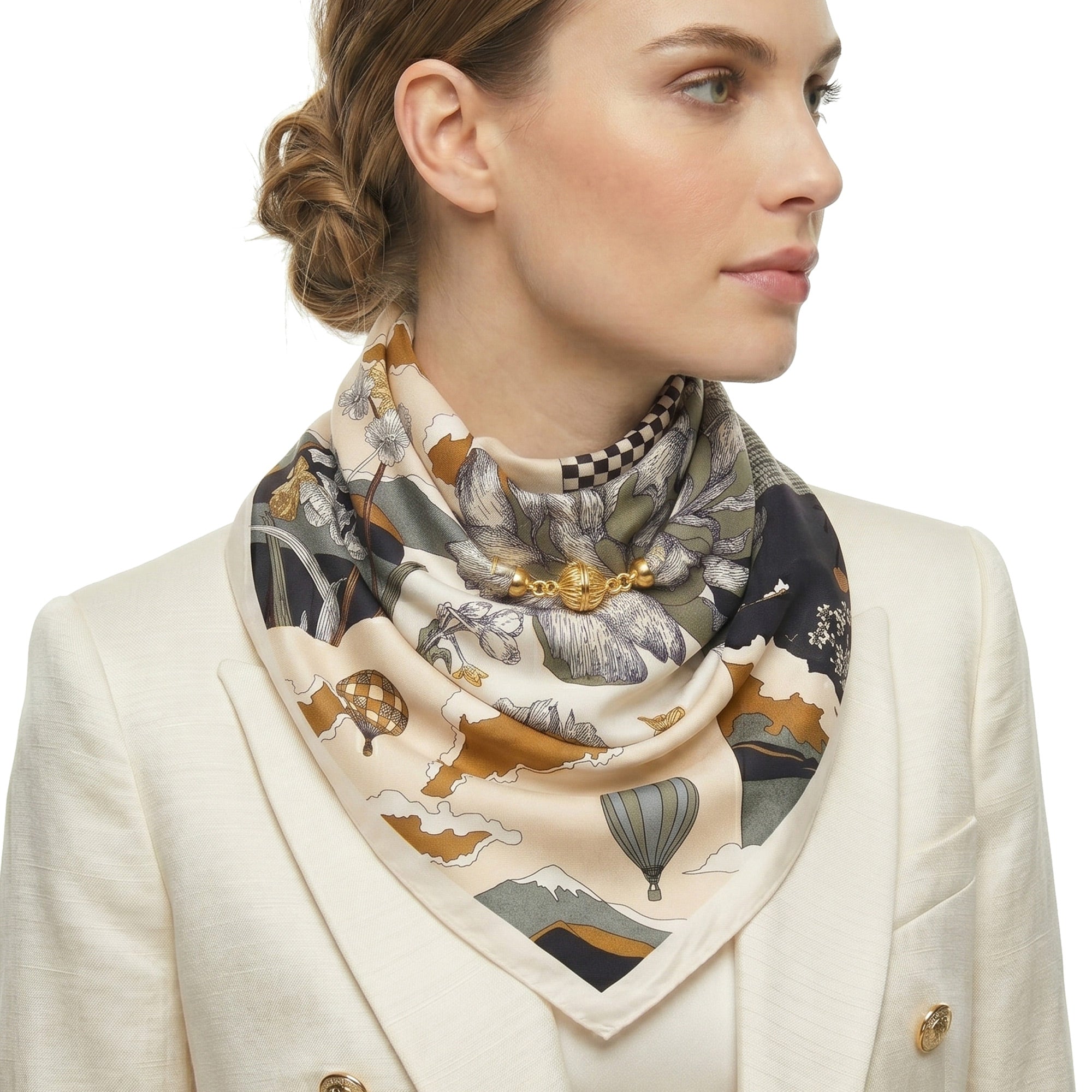 Damska, beżowa apaszka z zapięciem magnetycznym pozwala na ułożenie materiału bez ręcznego wiązania węzłów. Kwadratowy model LUNA wyposażono dodatkowo w złoty klips o charakterze biżuteryjnym, który trwale stabilizuje tkaninę. Format 68x68 cm ułatwia dopasowanie dodatku do dekoltu płaszcza lub marynarki w codziennych zestawieniach.