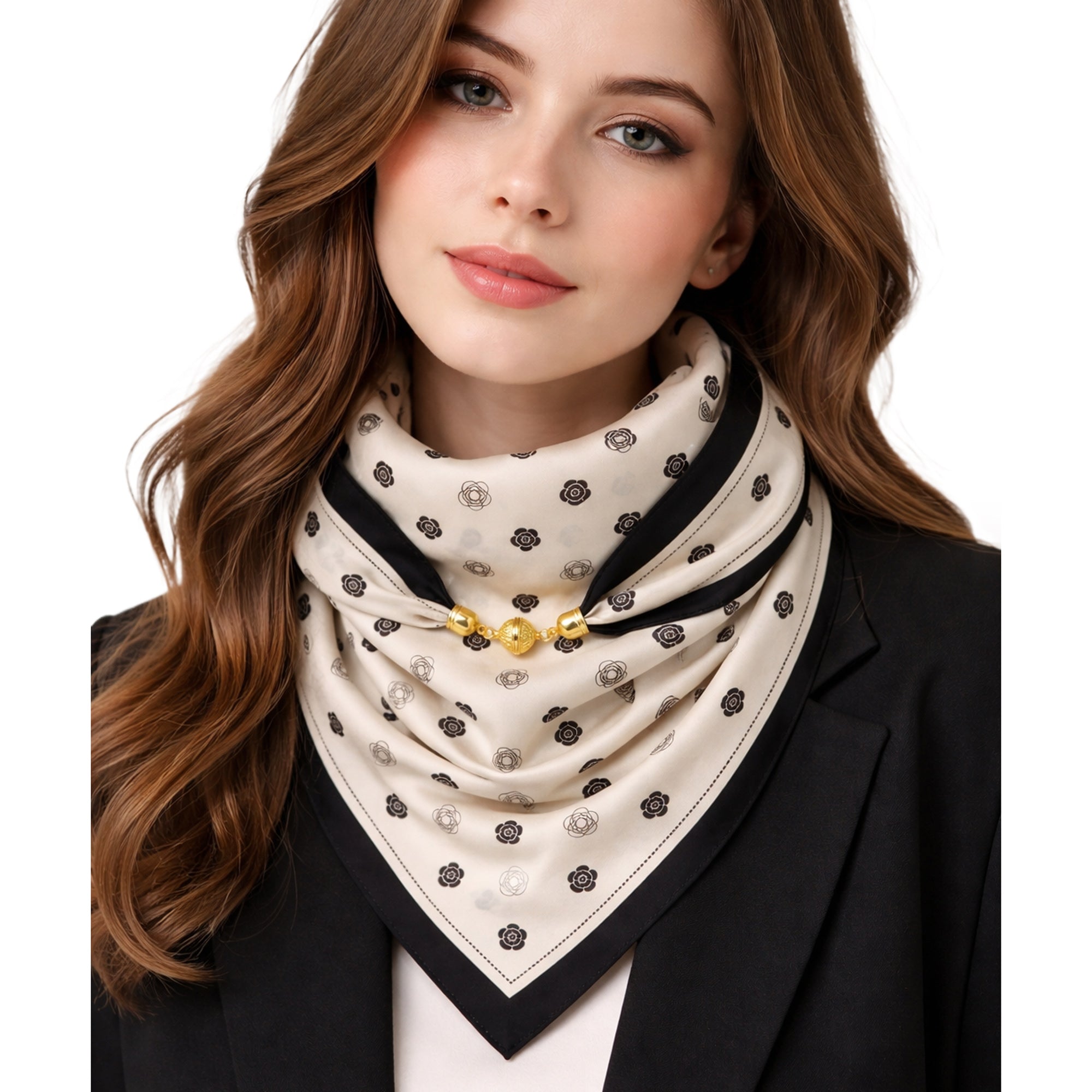 Casualowa, beżowa apaszka damska MIA wyróżnia się ozdobną, złotą zapinką, która całkowicie zastępuje tradycyjne węzły. Wbudowane zapięcie magnetyczne ułatwia codzienne zakładanie i pełni funkcję subtelnego detalu biżuteryjnego. Kwadratowy format o wymiarach 68x68 cm pozwala na swobodne ułożenie materiału pod kołnierzem płaszcza lub marynarki.