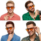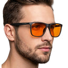 Kwadratowe, czarne męskie okulary NERDO to model w stylu nerdy przeznaczony do pracy przed ekranami i czytania. Pełne oprawki z lekkiego poliwęglanu oraz stałe noski gwarantują stabilne ułożenie na twarzy bez konieczności częstych poprawek. Zastosowane pomarańczowe soczewki typu amber z filtrem blue-light bezpośrednio ograniczają wpływ światła niebieskiego emitowanego przez urządzenia cyfrowe.