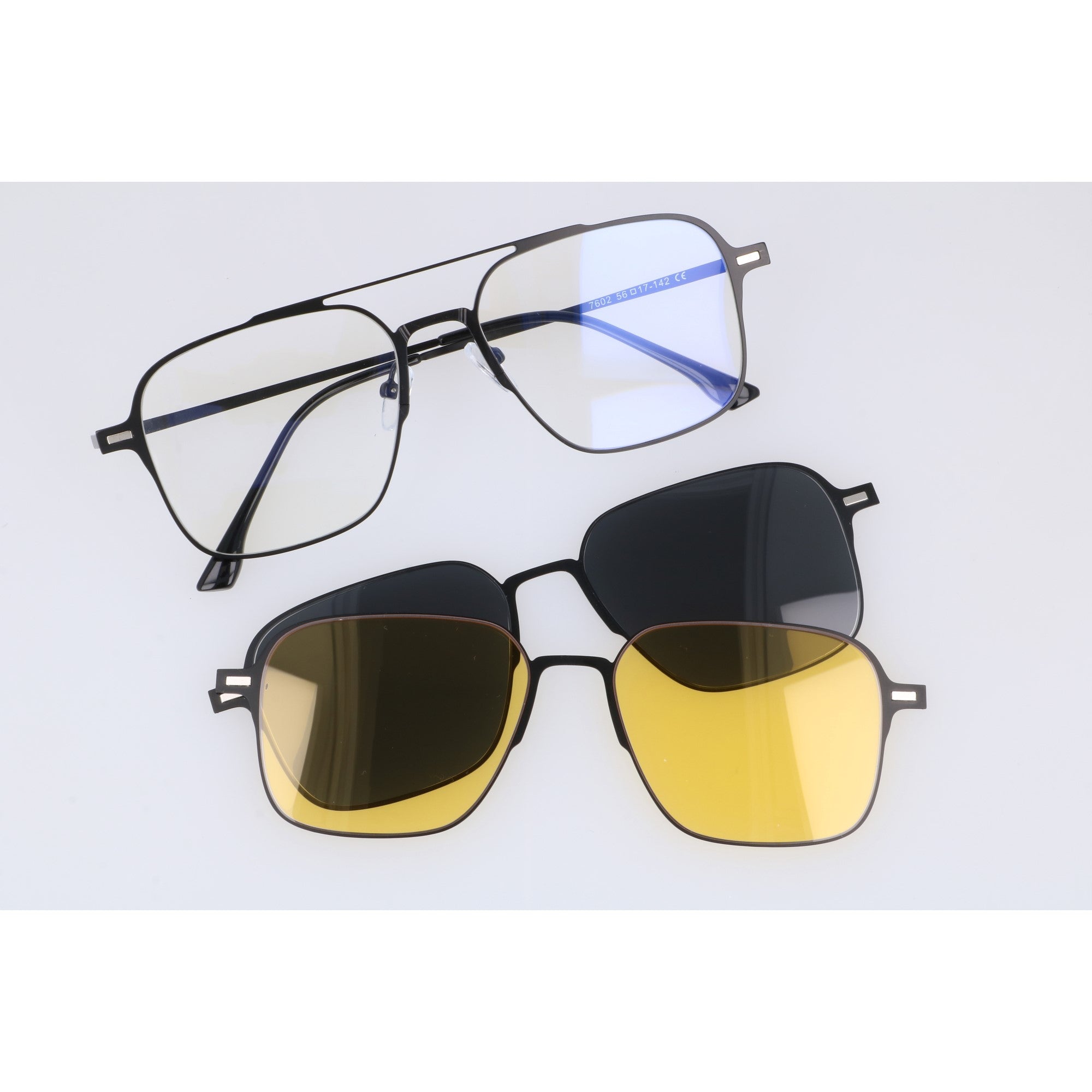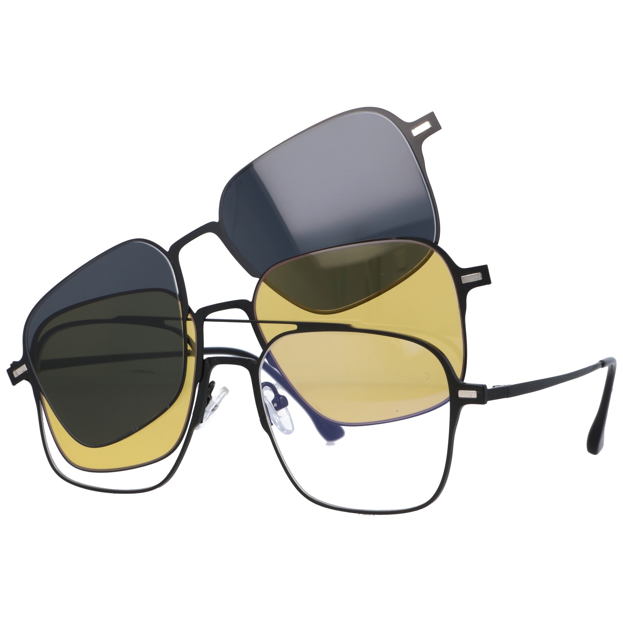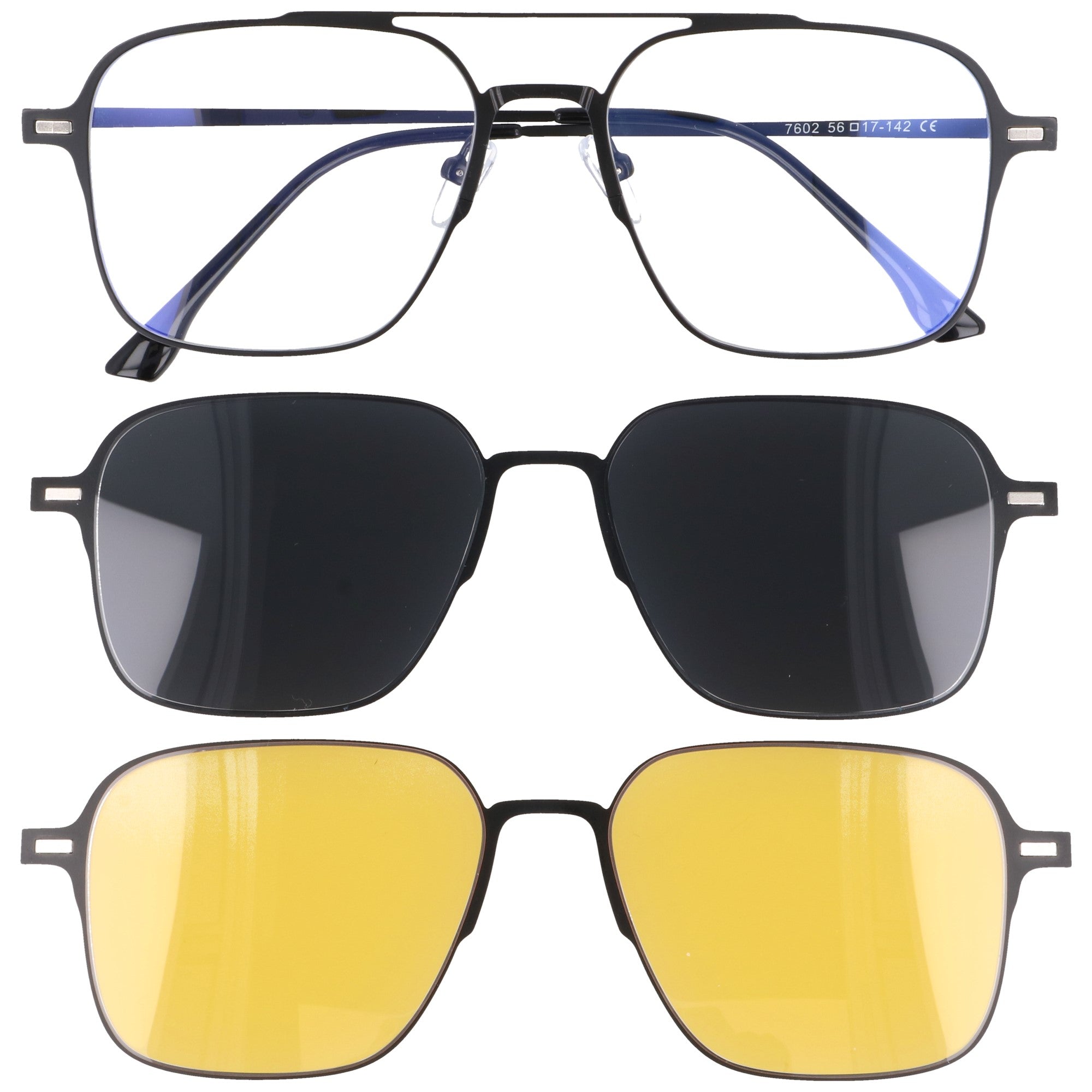 Odkryj wszechstronność i funkcjonalność w jednym stylowym wydaniu! Nasze oprawki korekcyjne CLIP ON w kształcie pilotki to rozwiązanie dla osób, które cenią praktyczność i nowoczesny design. W zestawie znajdziesz okulary zerówki z filtrem blue light oraz dwie magnetyczne nakładki: czarną polaryzacyjną, idealną na słoneczne dni, oraz żółtą, stworzoną z myślą o komfortowej jeździe nocą. System magnetycznego mocowania po całej frontowej oprawce pozwala na błyskawiczną zmianę nakładek, a nawet nałożenie dwóch jednocześnie. Solidna, czarna metalowa oprawka z regulowanymi silikonowymi noskami i trwałymi metalowymi zawiasami doskonale sprawdzi się zarówno dla kobiet, jak i mężczyzn. Okulary posiadają specjalnie zaprojektowane oprawki, dzięki którym bez problemu można wstawić szkła korekcyjne u optyka.